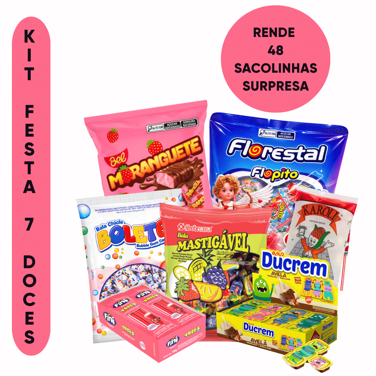 Transforme a festa das crianças em um momento inesquecível! O Kit Aniversário Infantil com 7 Doces Diferentes é a solução prática e econômica para montar 48 sacolinhas surpresa completas, cheias de guloseimas que a criançada ama. Ideal para festas infantis, escolas, eventos e comemorações, ele facilita sua organização e garante alegria para todos os convidados.