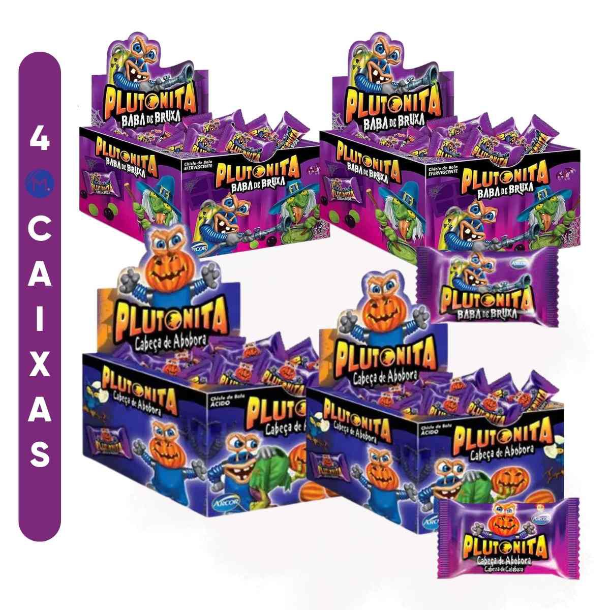 Esse kit contém 4 caixas de chiclete Plutonita: 2 caixas do modelo Baba de Bruxa e 2 caixas do modelo Cabeça de Abóbora.