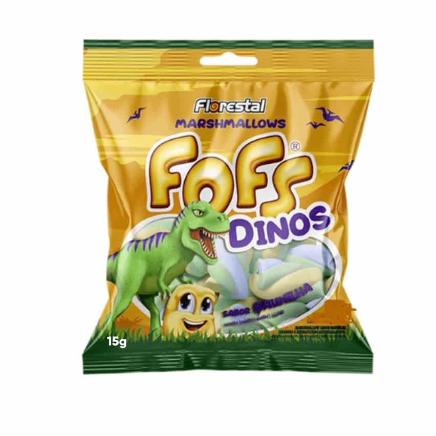 Desenvolvido para os apaixonados por dinossauros, a Florestal lançou o Fofs Dinossauro. O Marshamallow tem formato twist com sabor delicioso de baunilha - nas cores rosa, verde e amarelo.
